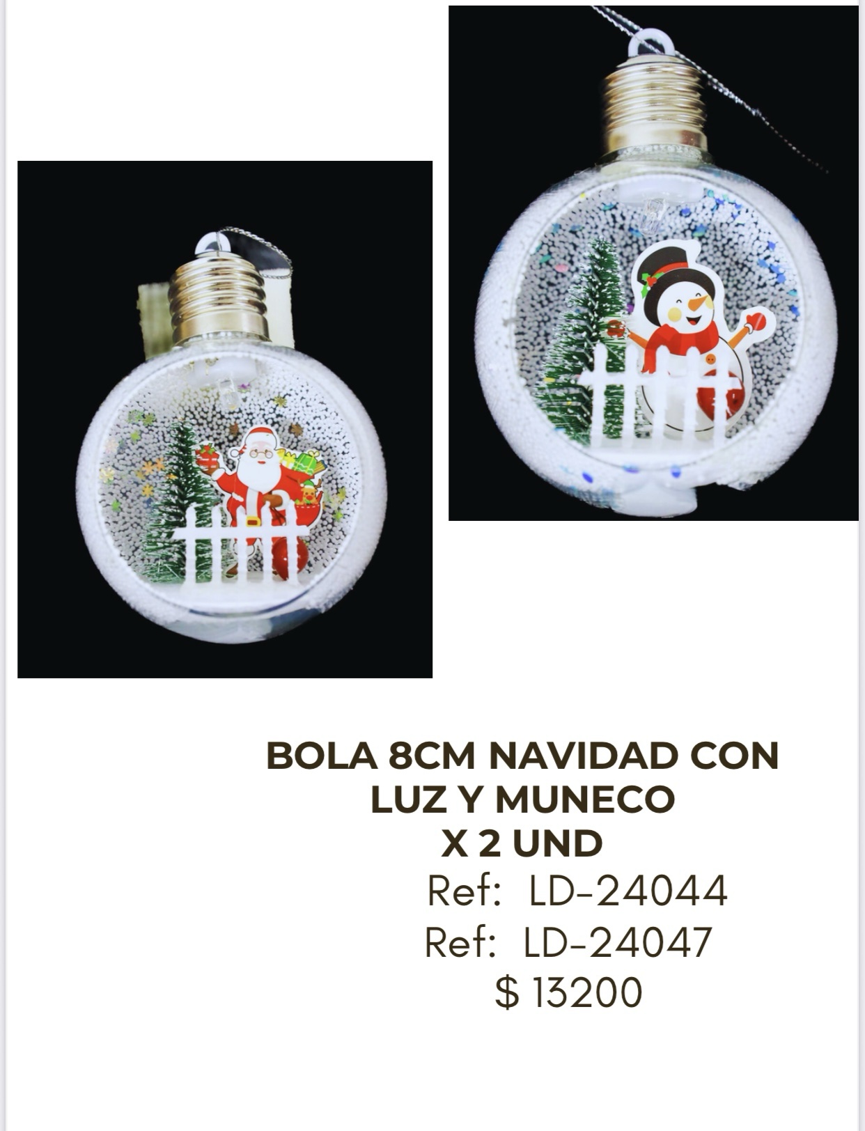 Bola 8cm Navidad con Luz y Muñeco x 2 unidades